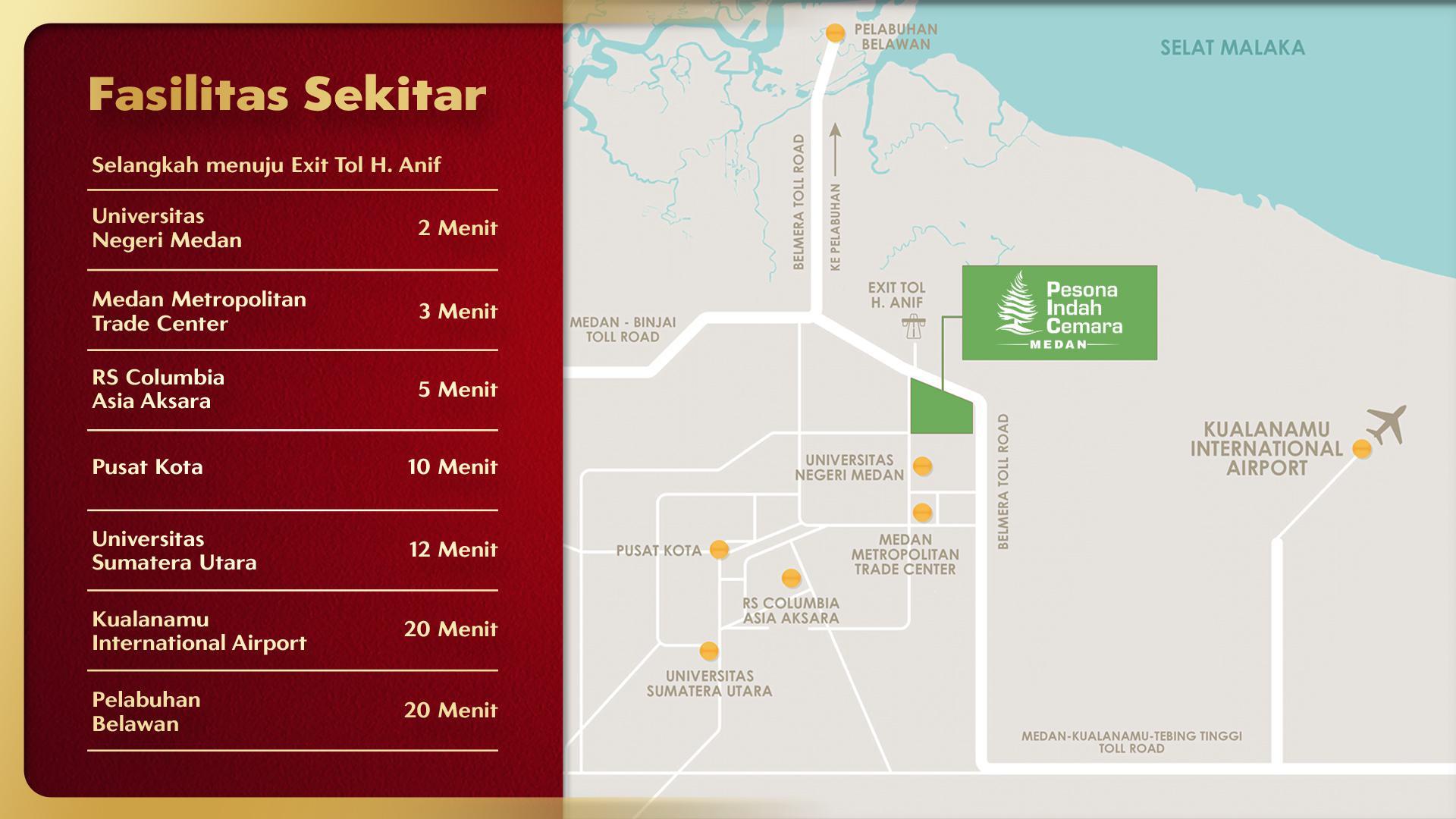Pesona Indah Cemara terletak di kawasan strategis Cemara, salah satu area hunian paling berkembang di Medan. Lingkungan sekitar dikenal tenang, hijau, dan tertata rapi dengan akses mudah menuju berbagai fasilitas modern. Hanya beberapa menit dari Cemara Asri, Krakatau, dan Pancing, kawasan ini dikelilingi pusat kuliner, sekolah unggulan, supermarket, rumah sakit, dan area komersial yang terus berkembang.